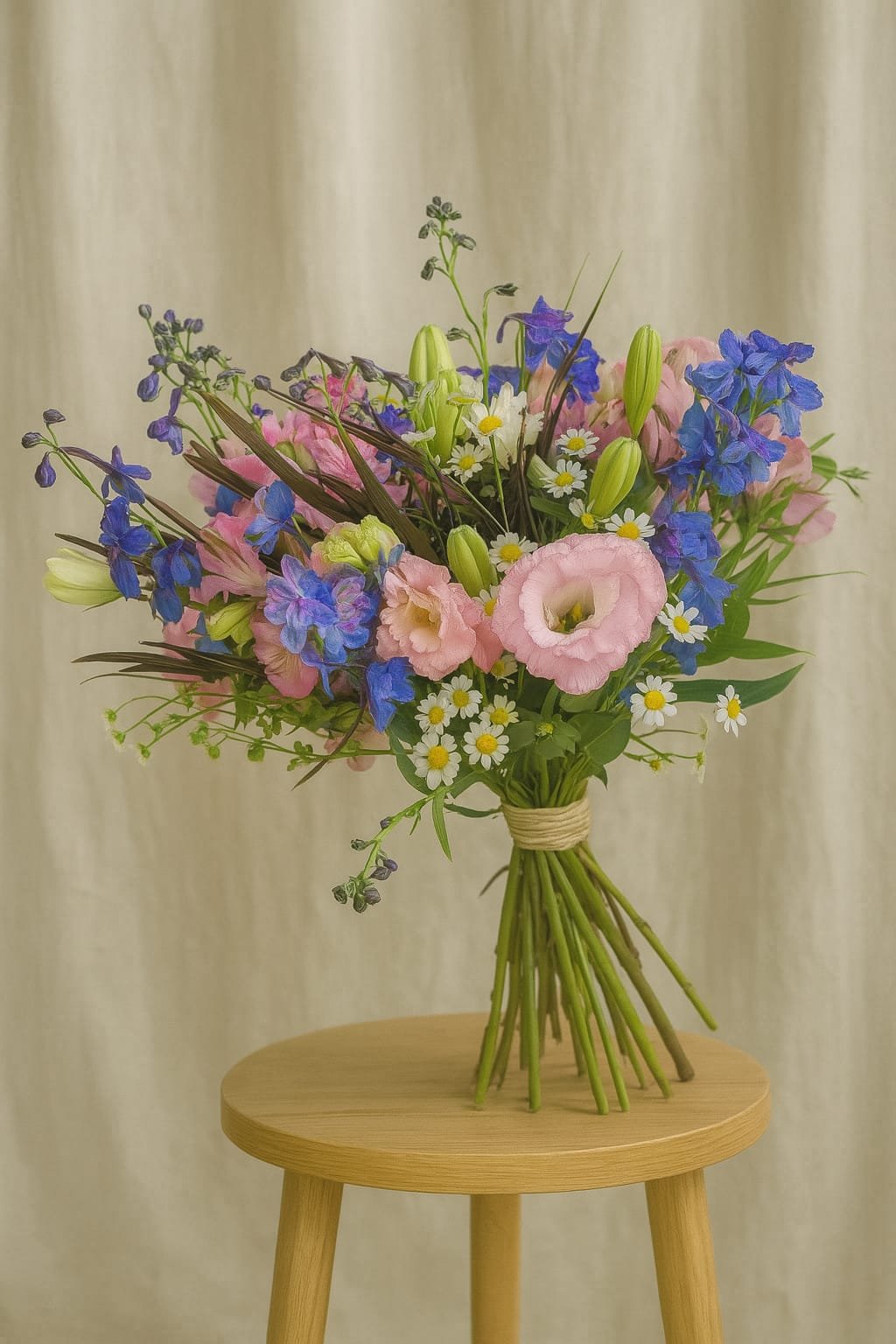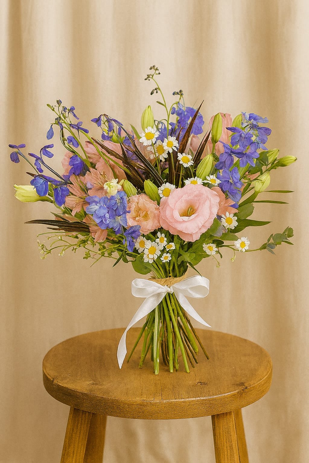 זר טבעי המשלב פרחי שדה עם אלגנטיות מהטבע
